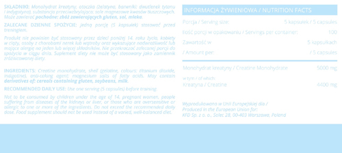 Съставки: креатин монохидрат, обвивка на капсулата (желатин, колири: титаниев диоксид, индиготин), средство против слепване: магнезиеви соли на мастни киселини.