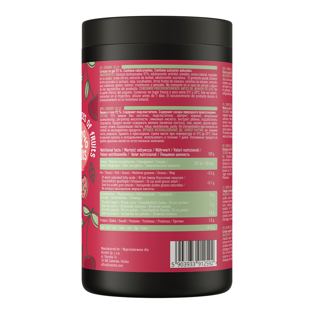 Черешово желе без добавена захар от OstroVit е забележителна възможност за всички, които искат да се поглезят с вкусни сладки изкушения без компромис с калориите или здравето си. С минимално съдържание на захар, и то под формата на естествени подсладители, и най-високите стандарти за качество, това желе е отличен избор за всеки здравословен хранителен план.
