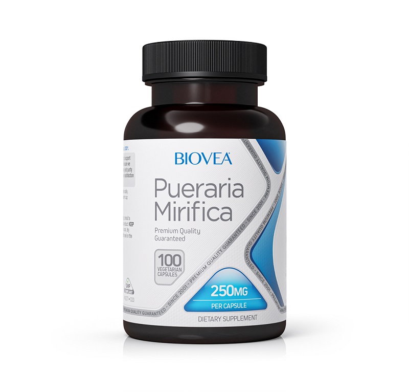 Pueraria Mirifica (Пуерария мирифика) 250 мг 100 капсули от Biovea е изключителна хранителна добавка, търсена от нашите клиенти за подмладяване, уголемяване на гърдите и поддържане на размера им. Тази добавка се предлага в опаковка от 100 капсули, достатъчна за 50 дни. Препоръчва се да се приема по една капсула сутрин и вечер, като всяка капсула съдържа екстракт от корен на растението Пуерария мирифика.
