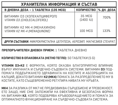 Няколко научни изследвания потвърждават, че комбинирането на витамини D3 и K2 значително подобрява костната минерална плътност, предотвратява фрактури и подобрява здравето на сърдечно-съдовата система. Този продукт е особено полезен за възрастни хора, спортисти или хора, които страдат от хроничен недостиг на витамин D.