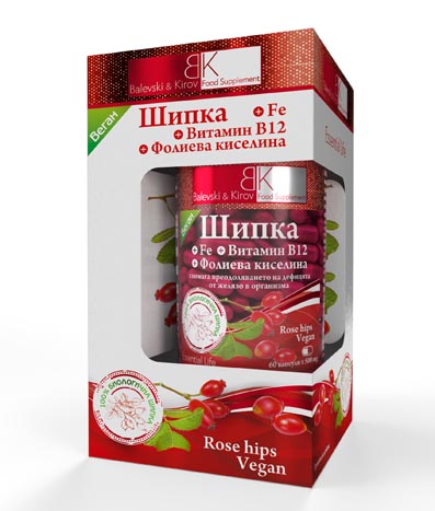 Шипка, Желязо, Фолиева киселина и Витамин В12 в капсулите от Balevski & Kirov, които ние от Biomall.bg Ви предлагаме на топ цена, съдържа комбинация от хранителни вещества, които са научно формулирани в подпомагане на веганското здраве – сушен плод от шипка, веганско желязо (Iron Bisglycinate), фолиева киселина и витамин B12 (Methylcobalamin).