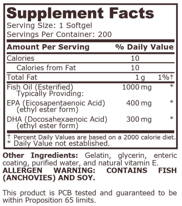 Консумацията на Fish Oil 400 EPA/ 300 DHA на Pure Nutrition оказва благоприятно влияние върху сърдечната функция и понижава риска от сърдечно-съдови болести. Освен това, подобрява холестеролния профил, като помага да се намали лошия за сметка на добрия холестерол в организма. Рибеното масло EPA/DHA Omega-3 Fish Oil на капсули повишава гъвкавостта и плътността на костите и подобрява калциевия баланс, помагащ за здравината на костите. Освен това, Омега-3 Fish Oil на добра цена поддържа здравето на мозъка и нервите, и помага за зрителната функция. Полиненаситените омега 3 мастни киселини EPA (eicosapentaenoic acid) и DHA (docosahexaenoic acid) намаляват тромбоцитната агрегация, триглицеридите, фибриногена и LDL-C, ако техните стойности са се повишили. Също така, тези две есенциални мастни киселини притежават противовъзпалителни и антиаритмични свойства. Според Световната здравна организация (СЗО) трябва да ядем риба поне един път седмично, поради голямото съдържание на полиненаситени омега–3 мастни киселини. Препоръчва се есенциалните мастни киселини – омега 3 и омега 6, да ни доставят от 6 до 10 % от дневния енергиен прием.