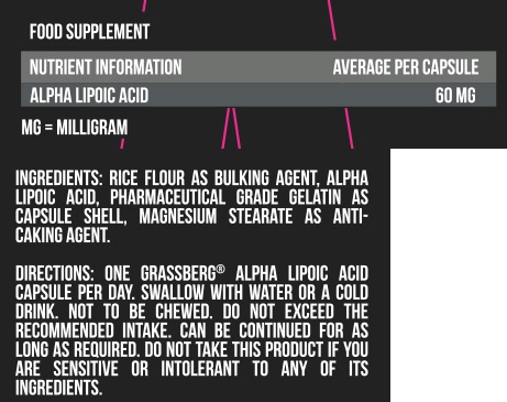 Съставки: пълнител (оризово брашно), алфа липоева киселина, обвивка на капсулата (желатин от фармацевтичен клас), антислепващ агент (магнезиев стеарат).