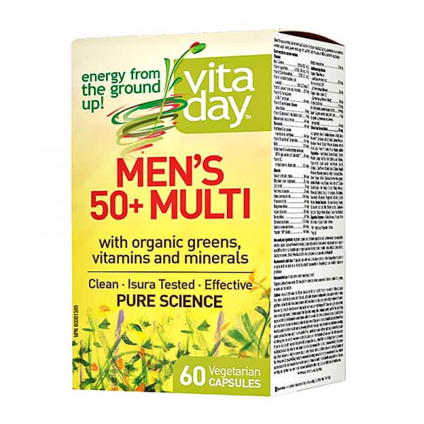 Мултивитаминният комплекс VitaDay Men’s 50 Multi на Natural Factors предоставя широк спектър от витамини и минерали, богати антиоксиданти и храносмилателни ензими, което го прави особено полезен за здравето на мъжете в зряла възраст: