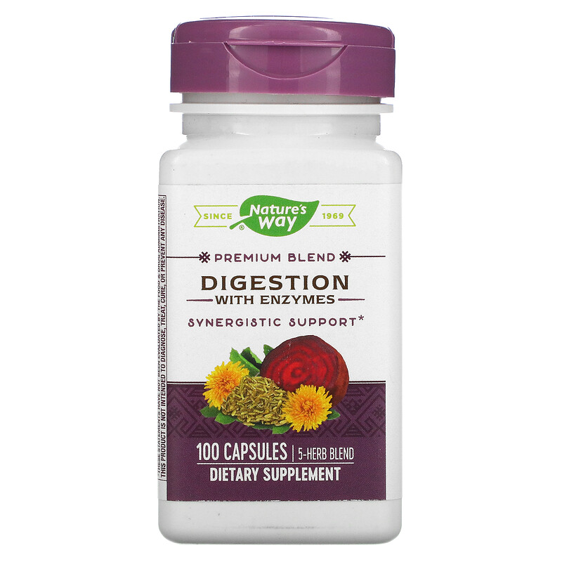 Digestion with Enzymes 100 капсули на страхотна цена от Nature's Way е тук, за да Ви помогне. Това е изцяло натурален продукт, който ще облекчи болката в стомаха Ви. Той съдържа така полезните храносмилателни ензими, съчетани със състава на глухарче, тинтява, червено цвекло, копър и лют червен пипер.