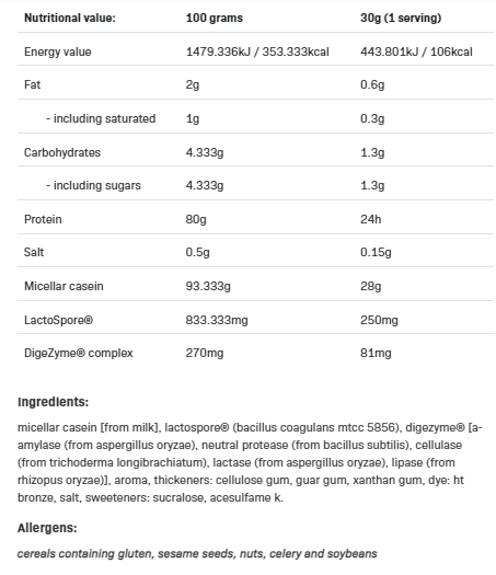 Съставки: Мицеларен казеин 24 g, LactoSpore® (пробиотик), DigeZyme® (ензимен комплекс).